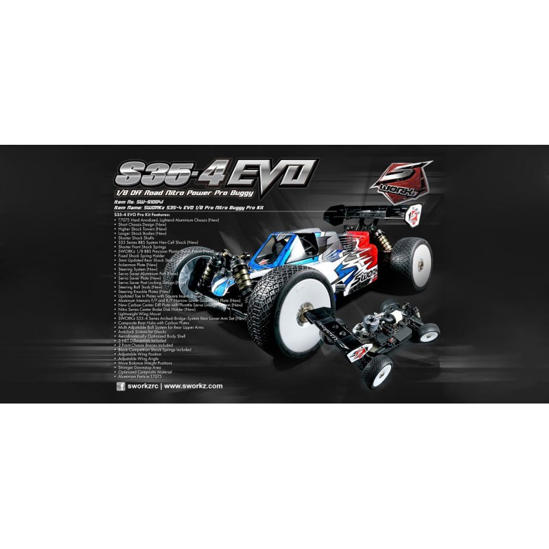 Continuando con la exitosa plataforma SWORKz S35-4 1/8 Nitro Buggy, el último S35-4 EVO está diseñado para un nivel de carreras aún más alto.