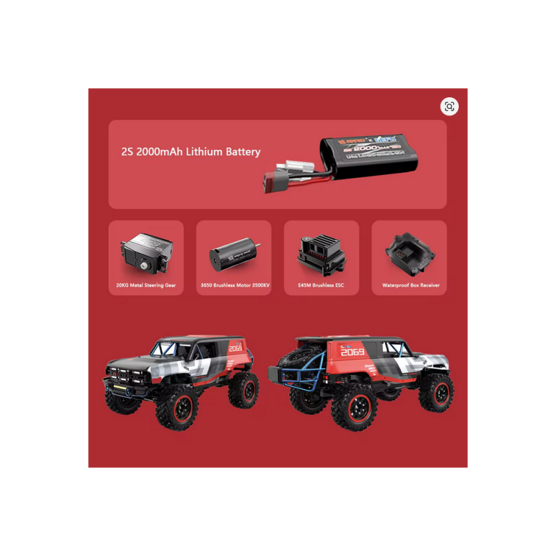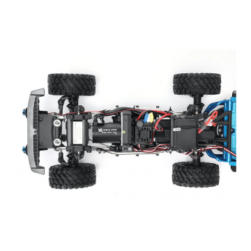 Algunas de las características más destacadas de este increíble crawler son: una carrocería de aleación de aluminio sujeta con imanes, ejes portal delantero y trasero para aumentar la distancia al suelo, rodamientos a bolas en toda la transmisión, tren motriz principalmente metálico, suspensión independiente ajustable, chasis con largueros de aleación, rueda de repuesto funcional y sistema de luces LED. La potencia y control de la transmisión se suministran gracias a un potente motor brushless sensored 3650 3500KV, un ESC impermeable de 45A y una batería Li-ion 2S (7,4V) de 2000mAh.