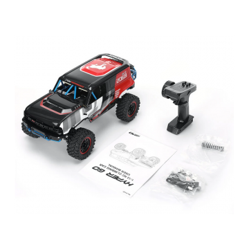 Listo para usarse, el H12P 1/12 Crawler viene completo con una emisora dedicada de 4 canales a 2.4GHz, receptor, un servo de dirección metálico de 20kg de par, una batería Li-ion 2S de 2000mAh y un cargador USB. Solo necesitarás 2 pilas “AA” para la emisora.