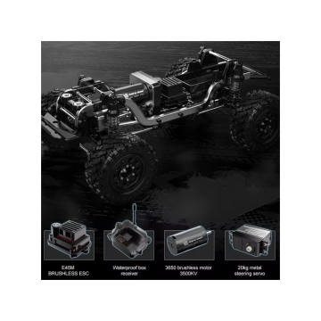 Algunas de las características más destacadas de este increíble crawler son: una carrocería de aleación de aluminio sujeta con imanes, ejes portal delantero y trasero para aumentar la distancia al suelo, rodamientos a bolas en toda la transmisión, tren motriz principalmente metálico, suspensión independiente ajustable, chasis con largueros de aleación, rueda de repuesto funcional y sistema de luces LED. La potencia y control de la transmisión se suministran gracias a un potente motor brushless sensored 3650 3500KV, un variador SMDF impermeable de 45A y una batería Li-ion 2S (7,4V) de 2000mAh.