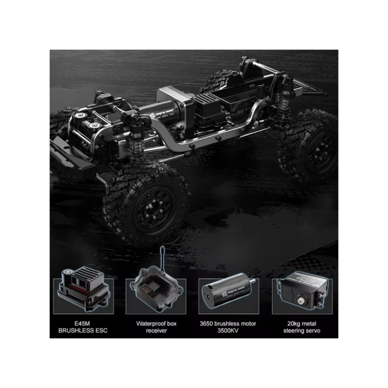 Siendo la versión + del H12Y, incluye un juego adicional de muelles de suspensión de distintas durezas y un juego de ruedas con neumáticos de diferente dibujo, para personalizar tus opciones de conducción. Otra gran característica de la versión + es el variador, un 45A con tecnología SDMF que mejora la suavidad, la aceleración uniforme, el frenado regenerativo y la regulación de la velocidad, lo que proporciona una experiencia de crawling aún mejor.