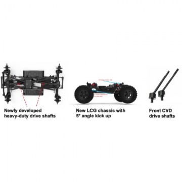 LCG aluminum chassis with 5° angle kick-up for a lower engine position and more ground clearance at the rear axle
