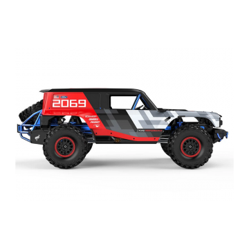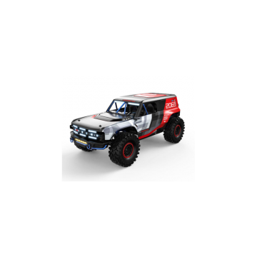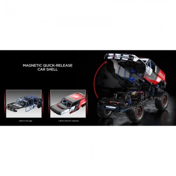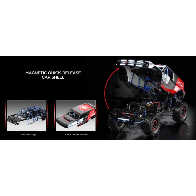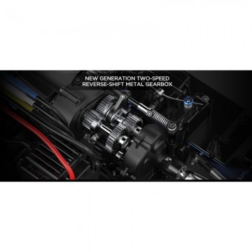El control de conducción se ve asistido por un servomotor de dirección de 35 KG, transmisión de accionamiento completamente metálica, diferenciales delanteros y traseros bloqueables, engranajes de alta/baja velocidad y un sistema único de control vectorial FOC que proporciona control absoluto del sistema de motor brushless con codificación magnética y detección sensorial. Totalmente compatible con baterías LiPo de 7.4v 2S y 11.1v 3S.