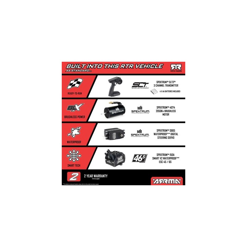Con su sistema sin escobillas Spektrum con capacidad para 6S, puede hacer que el KRATON 6S BLX 4X4 corra y salte a increíbles velocidades reales de más de 65 mph. Los componentes incluyen un ESC Firma 150A Smart V2 con un nuevo firmware más potente, un motor sin escobillas Firma 2050Kv, y un fiable servo de dirección S665 con engranajes de acero. La electrónica es estanca para que pueda volar sin preocupaciones en cualquier condición, incluso con barro o nieve.