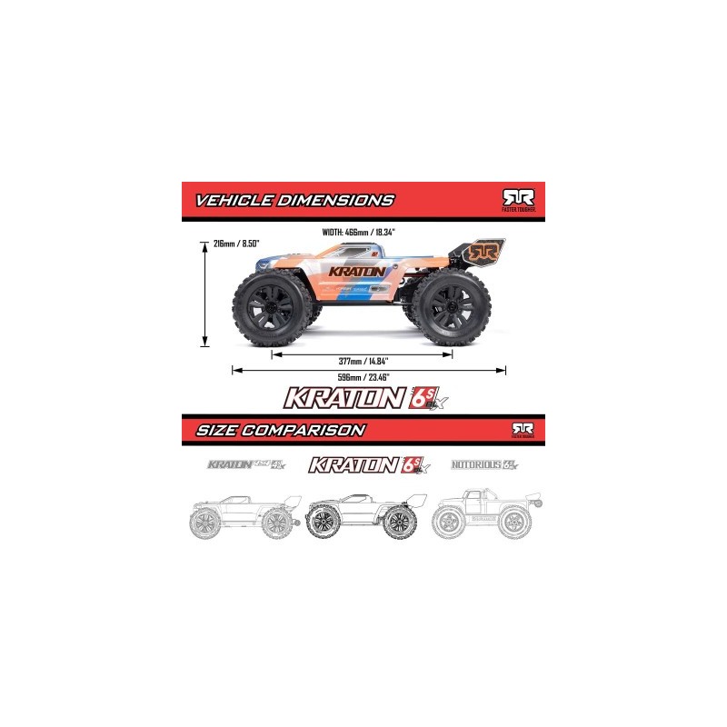 Lleve el KRATON 6S BLX 4X4 listo para rodar por cualquier terreno, incluyendo asfalto, tierra, grava o hierba corta. Instale algunas rampas o construya algunos montículos en la tierra: establezca un nuevo récord de larga distancia cada vez que salte. Con su elección de batería de 4S o 6S y cargador, tendrá todo lo que necesita para las emociones de un monster truck de velocidad de la forma en que sólo ARRMA las hace.