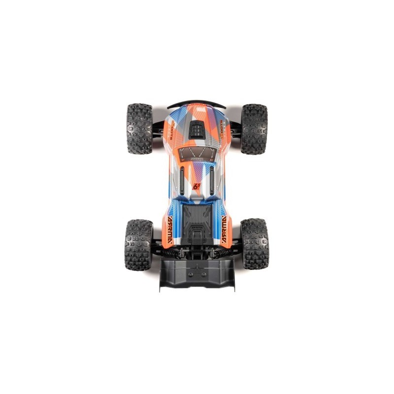 La placa del chasis, los diferenciales, el parachoques delantero, el cubrecárter e incluso el soporte del alerón han sido mejorados con la dureza EXB (Extreme Bash). Los nuevos protectores laterales, el refuerzo de dos piezas de torre a torre y la torre interior de la carrocería añaden más resistencia y simplifican el mantenimiento. La icónica carrocería del monster truck KRATON se presenta ahora en cuatro nuevos y llamativos acabados de fábrica multicolor, y cuenta con un cómodo sistema de retención de la carrocería sin pinzas y de liberación rápida.