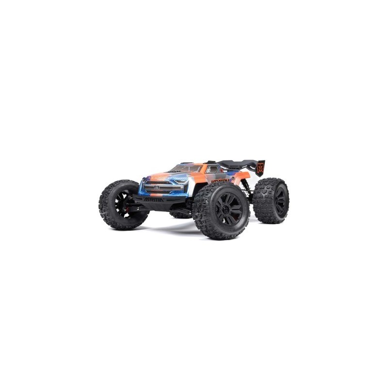 La estilizada carrocería del monster truck KRATON está disponible en cuatro llamativos acabados de fábrica multicolor. Su sistema de retención de la carrocería, de cierre rápido y sin clips, sirve a la vez de protección contra los golpes de la carrocería. El soporte para su alerón de alta carga aerodinámica tiene ahora durabilidad EXB (Extreme Bash) para resistir las roturas.